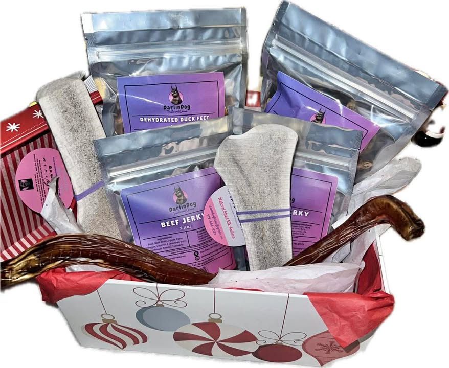 Looking for a box full of protein that also promotes joint health? The mac daddy of all dehydrated boxes has you covered. Complete with two large bags of dehydrated feet, two small bags of jerky, a large and medium bully stick, plus TWO Elk antlers, this box is sure to please the inner beast within your furry best friend!